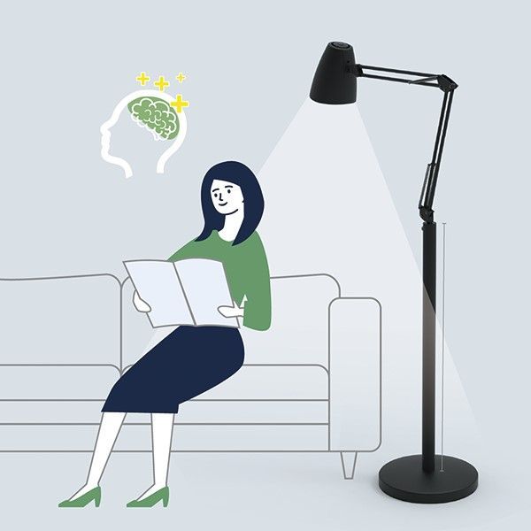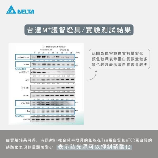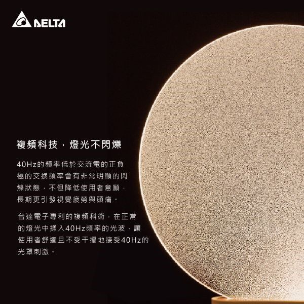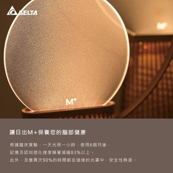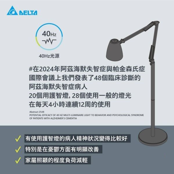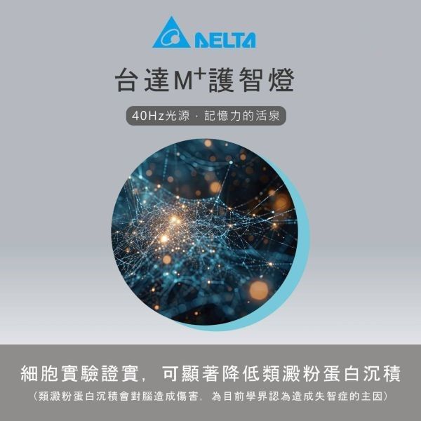 台達M+智護燈使用專利複頻燈光技術,讓人眼不受40Hz的閃爍干擾,可在舒適閱讀的當下,接受40Hz的刺激,延緩失智。